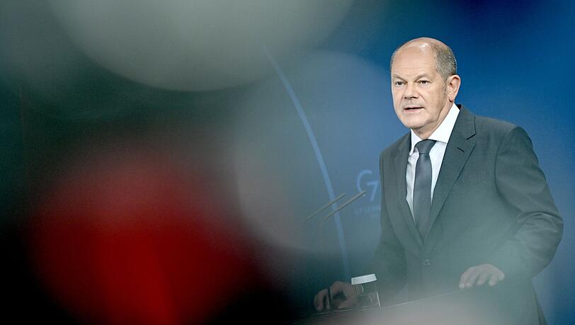 Bundeskanzler Scholz - Bundeskanzler Olaf Scholz (SPD) spricht bei einer Pressekonferenz im Bundeskanzleramt zu aktuellen Fragen der Energiepolitik. - Foto: Britta Pedersen/dpa Eine Turbine ist zum Symbol...weiterlesen »