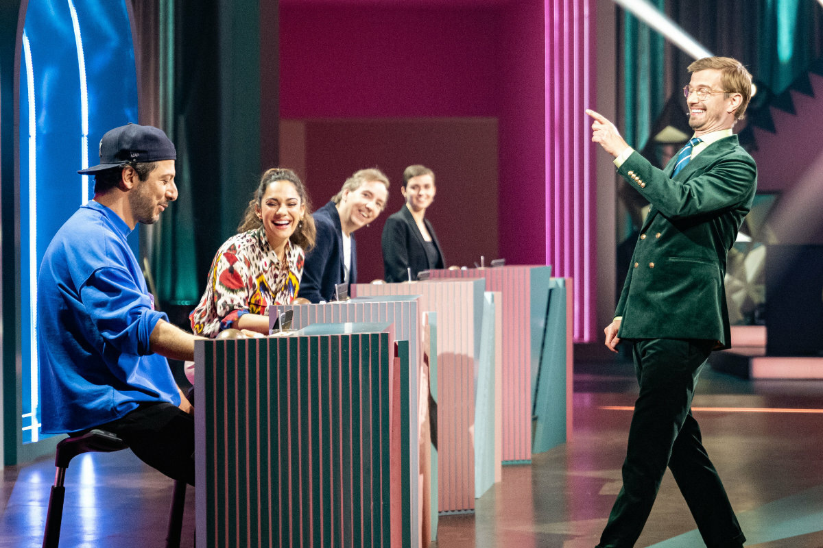Fahri Yardim (l-r), Nilam Farooq, Olli Schulz und Moderator Joko Winterscheidt in der ProSieben-Show «Wer stiehlt mir die Show?» In "Wer stiehlt mir die Show?" kämpft Joko Winterscheidt um seinen Moderationsjob....weiterlesen »