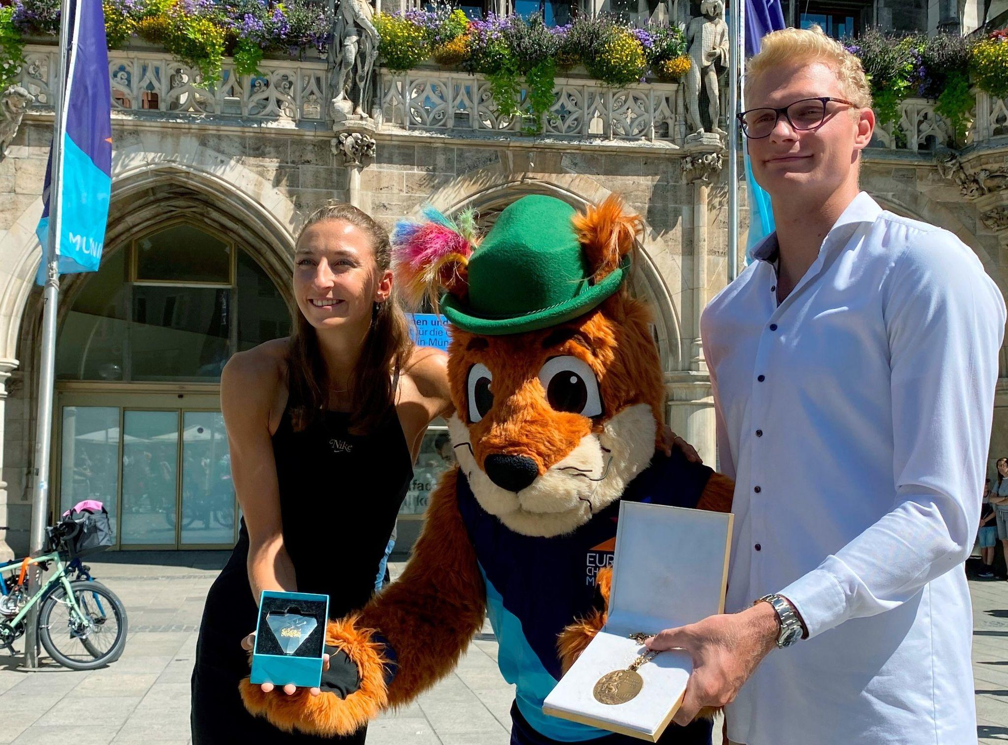 Ruderer Oliver Zeidler (r) und Leichtathletin Christina Hering (l) zeigen mit Maskottchen Gfreidi die Medaillen der European Championships. Einer-Fahrer Oliver Zeidler hat wenige Tage vor dem Beginn der...weiterlesen »