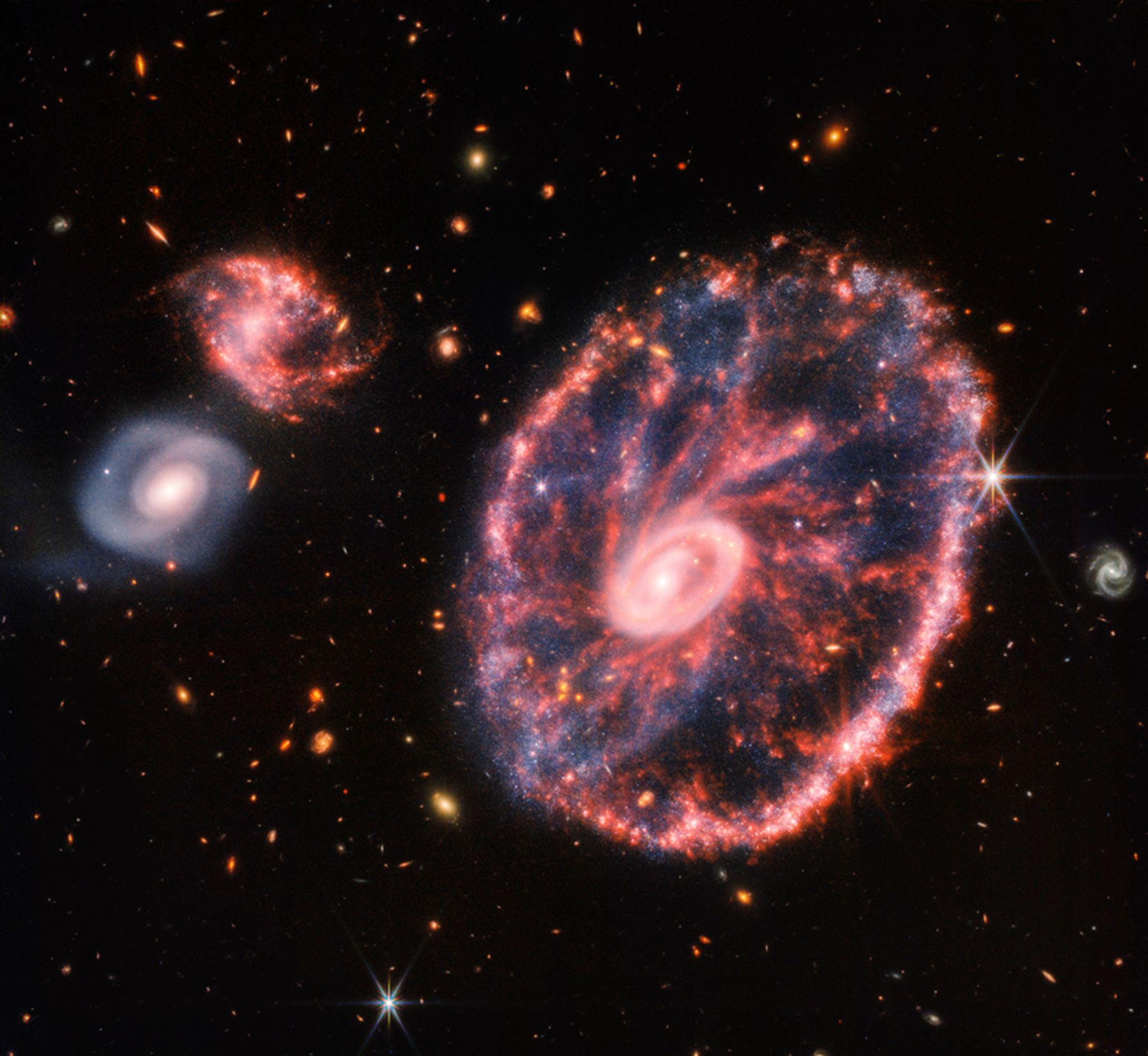 Dieses von der NASA zur Verfügung gestellte Handout-Foto zeigt eine große, rosa-blau gesprenkelte Galaxie, die einem Rad mit einem kleinen, inneren Oval ähnelt. Neue spektakuläre Bilder aus weiter, weiter...weiterlesen »