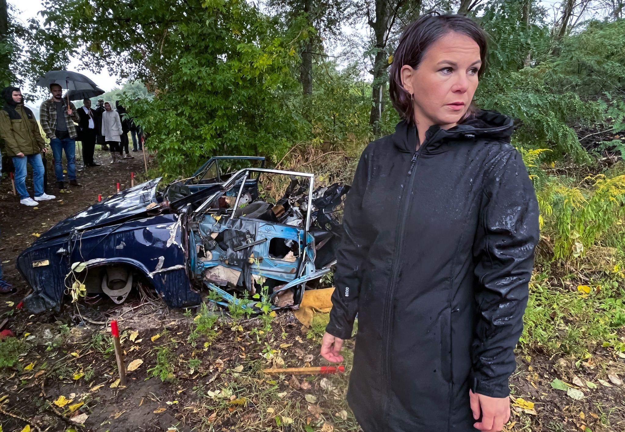 Außenministerin Annalena Baerbock besichtigt ein von Deutschland gefördertes Minenräumprojekt in der Nähe von Kiew. Das Auto im Hintergrund ist durch eine Mine zerstört worden. Die Außenministerin besucht...weiterlesen »
