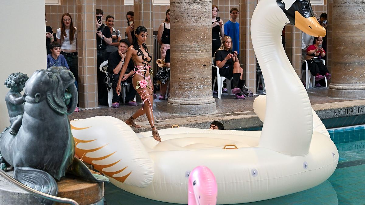 © dpa-infocom, dpa:240703-930-163241/1 Berlin Fashion Week - Kilian Kerner - „Herz im Kopf“ heisst die Kollektion des Berliner Designers Kilian Kerner. Ein Model zeigt hier eine Kreation davon bei der...weiterlesen »