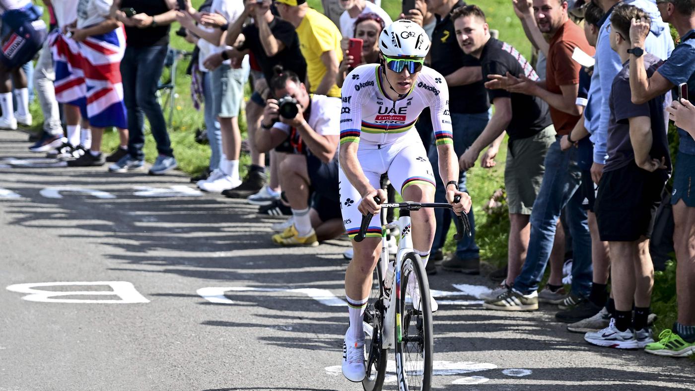 Der Slowene Tadej Pogacar (M) im Trikot des Weltmeisters. Copyright: Maarten Straetemans/Belga/dpa Beim Ardennen-Klassiker triumphiert Rad-Star Tadej Pogacar wie schon im Vorjahr souverän. Der Weltmeister...weiterlesen »