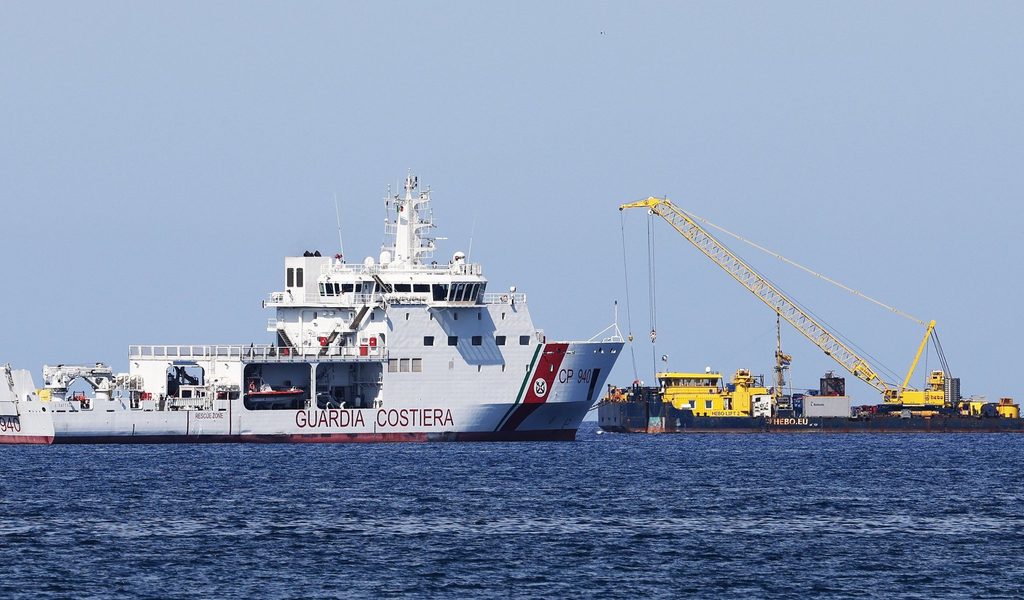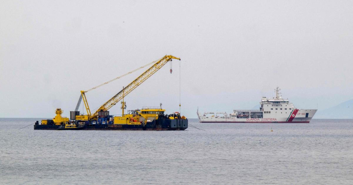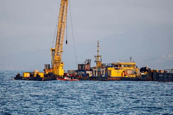 Der Lastkahn Hebo Lift 2 (rechts) ist am Ort des Schiffbruchs der Superjacht "Bayesian" vor der Insel Sizilien im Einsatz. Quelle: Alberto Lo Bianco/LaPresse via Z Der Untergang der Superjacht vor Sizilien...weiterlesen »