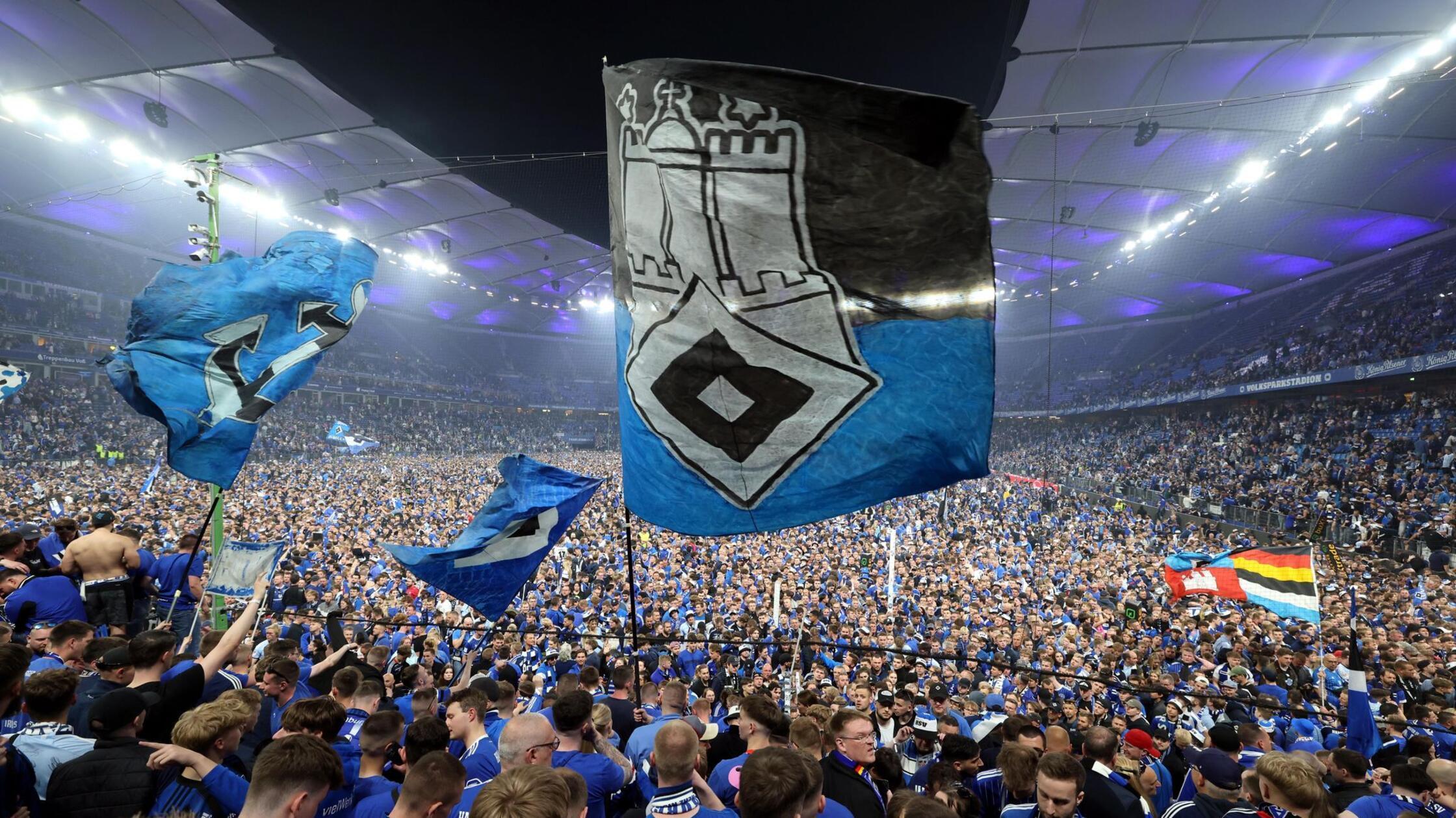 2. Fußball-Bundesliga Hamburg - Fans des HSV feiern eine rauschhafte Party nach dem Aufstieg. Viele Stadionbesucher stürmen nach dem Spiel auf den Rasen. Dabei verletzen...weiterlesen »