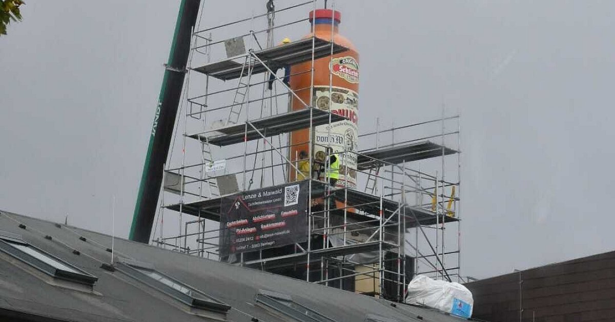 Mit einem Spezialkran wird eine riesige Schnapsflasche auf das Dach der Brennerei im Kreis Gütersloh gehoben. Die Aktion sorgt für mächtig Aufsehen.weiterlesen »
