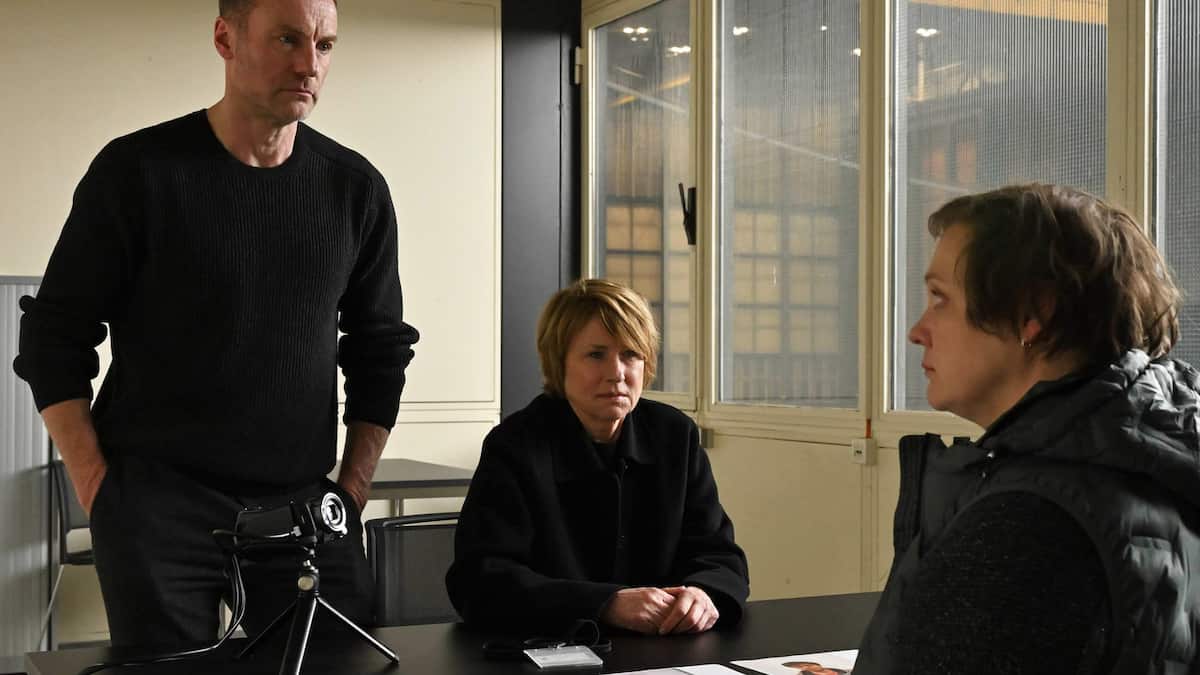 Susanne Bonard ( Corinna Harfouch ) und Robert Karow ( Mark Waschke , li.) befragen Annika Haupt (Annett Sawallisch, re.), die Geliebte des Opfers. Ein Mord, falsche Identitäten und die Bundesdruckerei:...weiterlesen »