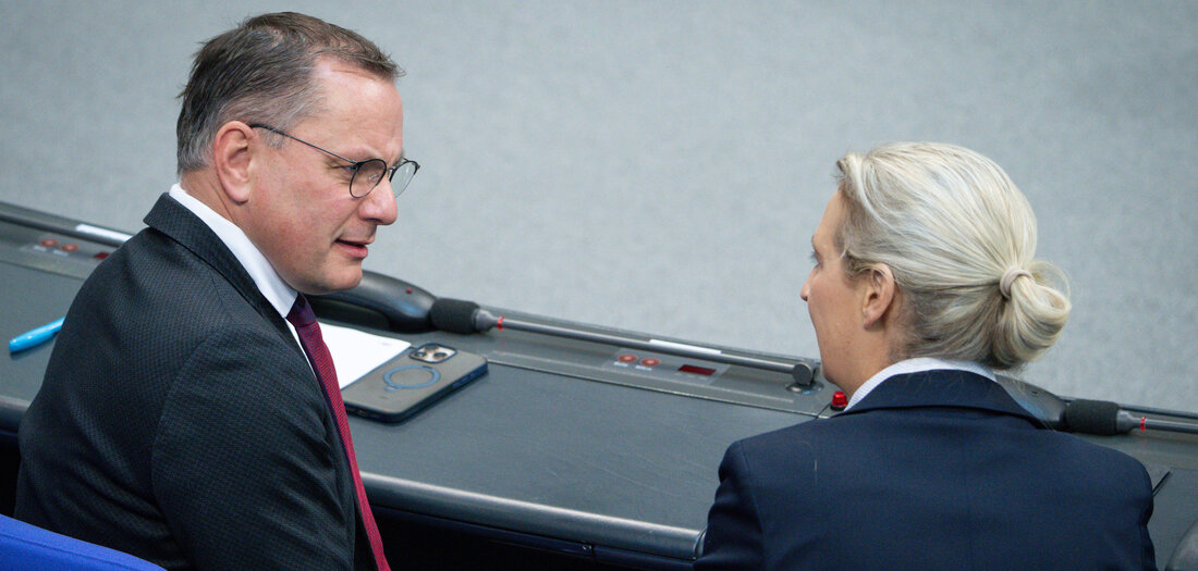 Debatte um AfD und Russland Reger Austausch über nicht empfehlenswerte Reiseziele: Tino Chrupalla und Alice Weidel im Plenum des Bundestages (Berlin, 6.11.2025) Die Meinungsverschiedenheiten über den »Russland-Kurs«...weiterlesen »
