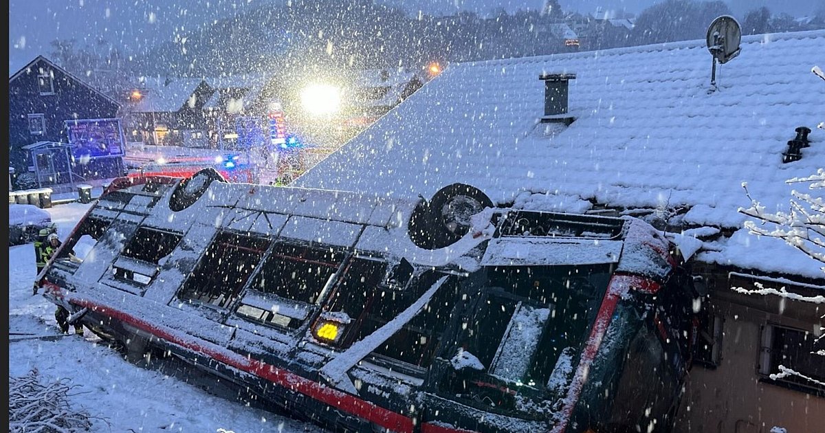 D: Autobus stürzt über Böschung und verkeilt sich am Dach liegend an Wohnhaus