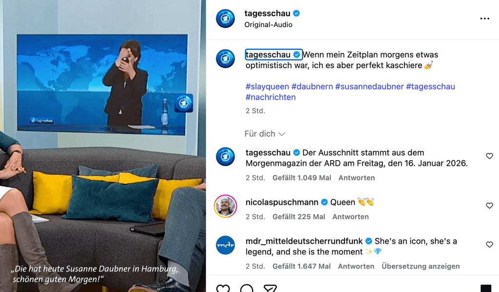 Charmantes Missgeschick beim ARD-"Morgenmagazin": Als sie zur Tagesschau in Hamburg schalten wollten, war Susanne Daubner noch nicht bereit – und das sah man ihr an. Witzige Panne am Freitagmorgen! "Tagesschau"-Moderatorin...weiterlesen »